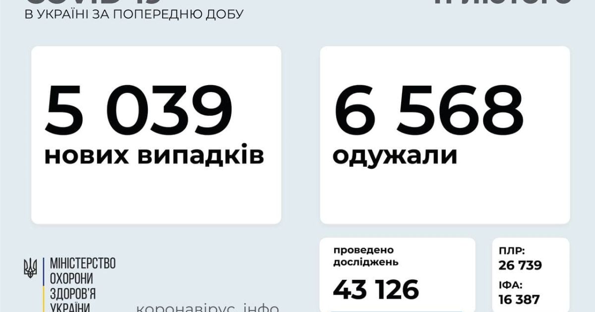 5 039 нових випадків коронавірусної хвороби COVID-19 зафіксовано в Україні станом на 11 лютого 2021 року. Зокрема, захворіли 277 дітей та 281 медпрацівник.