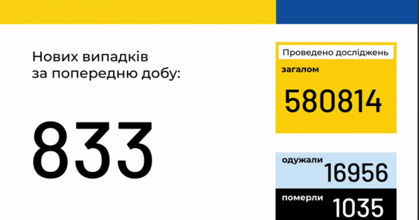 В Україні зафіксовано 833 випадки коронавірусної хвороби COVID-19. 23 червня (станом на 9:00) в Україні 38 074 лабораторно підтверджені випадки COVID-19, з них 1035 летальних, 16 956 пацієнтів одужало. За добу зафіксовано 833 нові випадки. Загалом проведено 580 814 тестувань методом ПЛР.