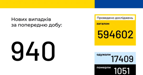 В Україні зафіксовано 940 випадків коронавірусної хвороби COVID-19