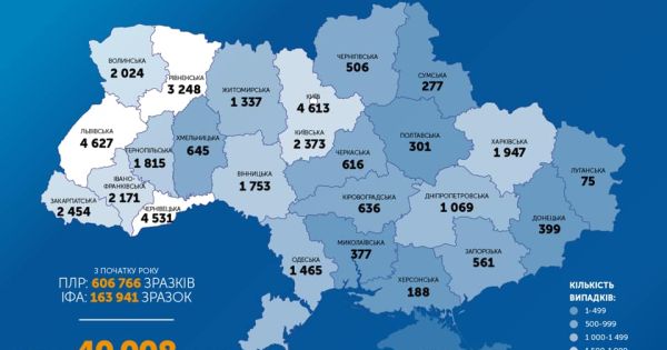 40 008 лабораторно підтверджених випадків COVID-19, з них 1067 летальних, 17 758 пацієнтів одужало. За добу зафіксовано 994 нові випадки. Загалом проведено 606 766 тестувань методом ПЛР.