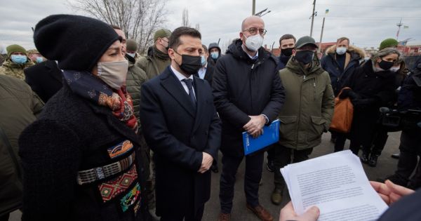 Президент України Володимир Зеленський і Президент Європейської ради Шарль Мішель поспілкувалися з представниками міжнародних гуманітарних місій на КПВВ «Щастя».