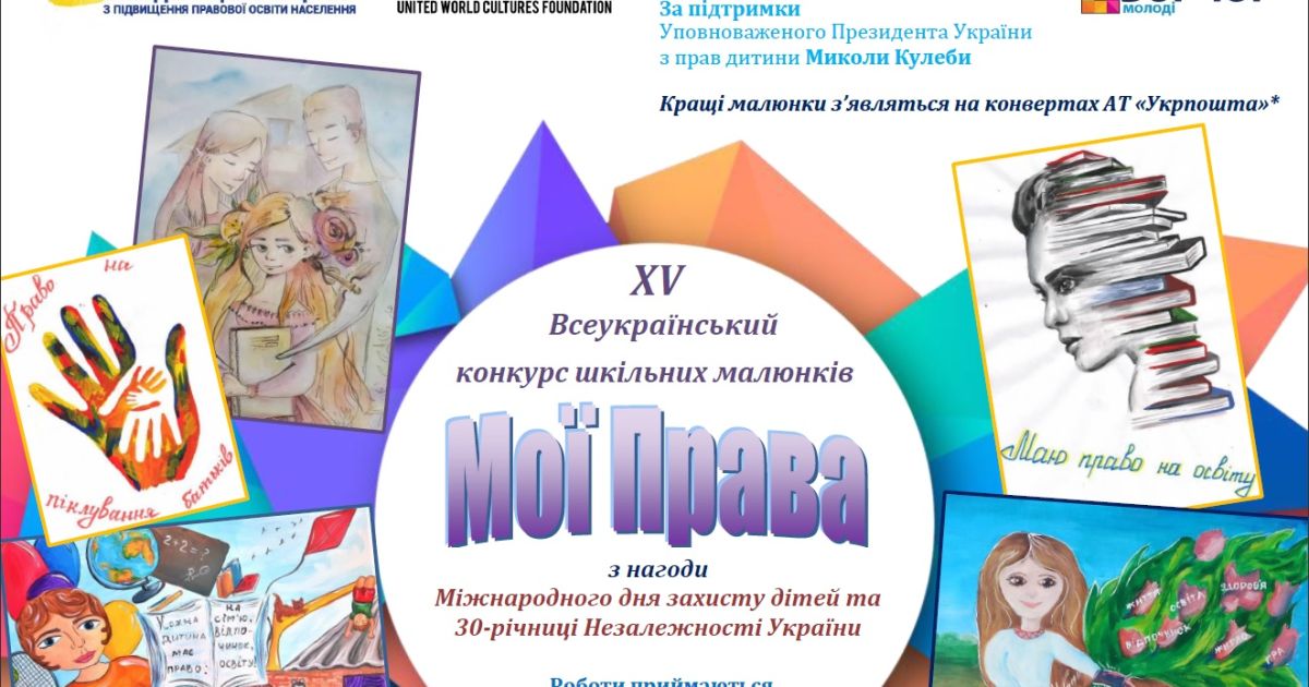 Український координаційний центр з підвищення правової освіти населення за участі Української молодіжної правничої асамблеї, Благодійного фонду «Об’єднання світових культур», Української асоціації підтримки творчої молоді та за підтримки Уповноваженого Президента України з прав дитини Миколи Кулеби запрошують учнів закладів загальної середньої освіти України віком до 18 років взяти учать XV (ювілейному) Всеукраїнському конкурсі шкільних малюнків «Мої права», з нагоди Міжнародного дня захисту дітей та 30-річниці Незалежності України.