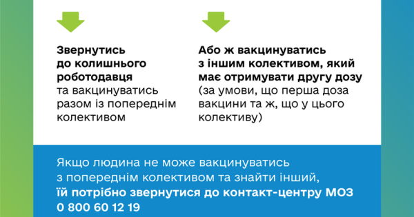 Як вакцинуватись другою дозою людині, яка першу отримала разом з організованим колективом, а потім змінила роботу, дивіться в інфографіці.