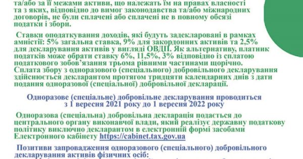 Одноразове (спеціальне) добровільне декларування проводиться з 1 вересня 2021 року до 1 вересня 2022 року