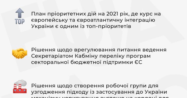 Затвердив план пріоритетних дій на 2021 рік, де курс на європейську та євроатлантичну інтеграцію України є одним із топ-пріоритетів. Зокрема, План включає заходи з виконання Угоди про асоціацію між Україною та ЄС.