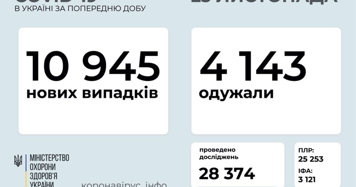 За даними Міністерства охорони здоров’я в Україні станом на 23 листопада зафіксовано 10945 нових випадків коронавірусної хвороби COVID-19 2020 року