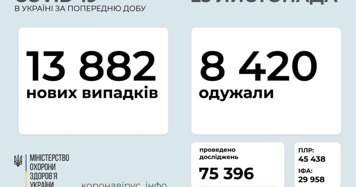 13 882 нові випадки коронавірусної хвороби COVID-19 зафіксовано в Україні станом на 25 листопада 2020 року. Зокрема, захворіли 684 дитини та 615 медпрацівників.