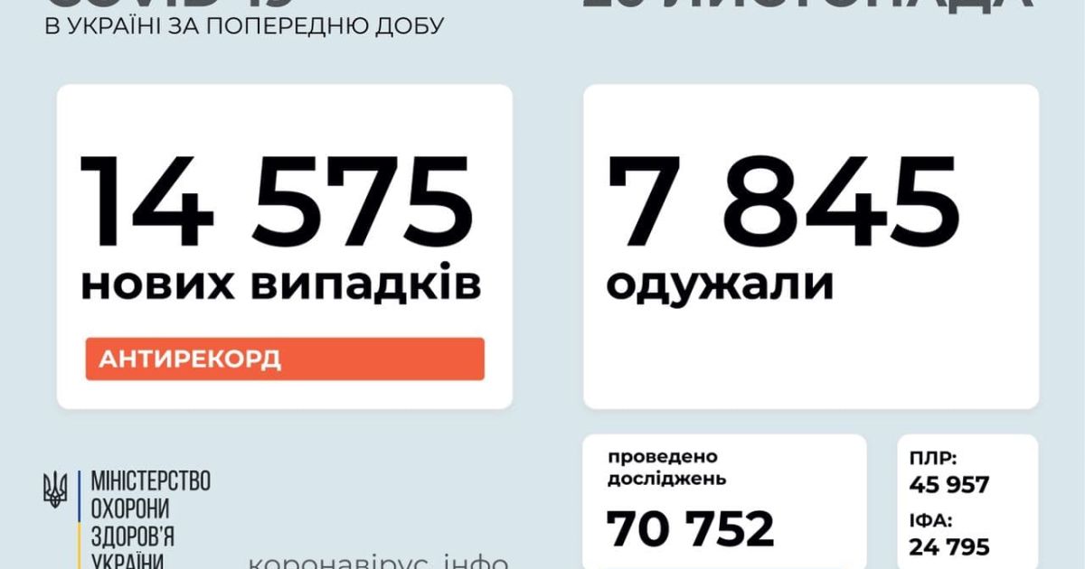 За даними Міністерства охорони здоров’я в Україні за добу зафіксовано 14 575 нових випадків COVID-19