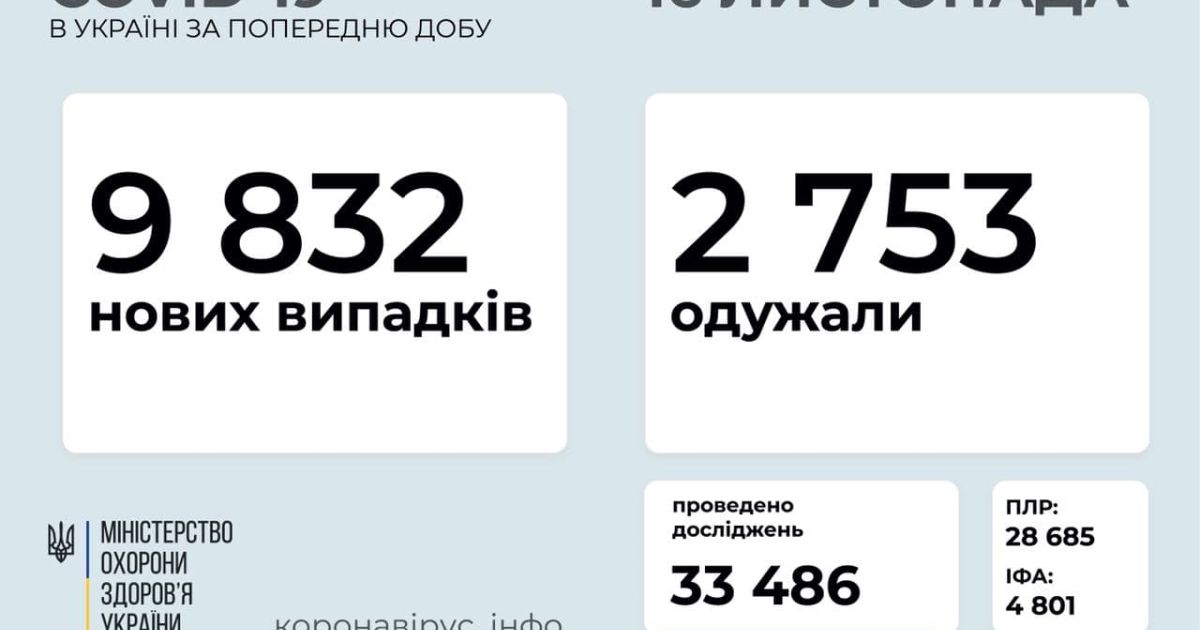 За даними Міністерства охорони здоров’я в Україні за добу зафіксовано 9 832 випадок коронавірусу
