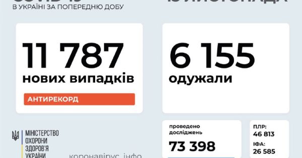 11 787 нових випадків коронавірусної хвороби COVID-19 зафіксовано в Україні станом на 13 листопада 2020 року. Зокрема, захворіли 388 дітей та 555 медпрацівників.