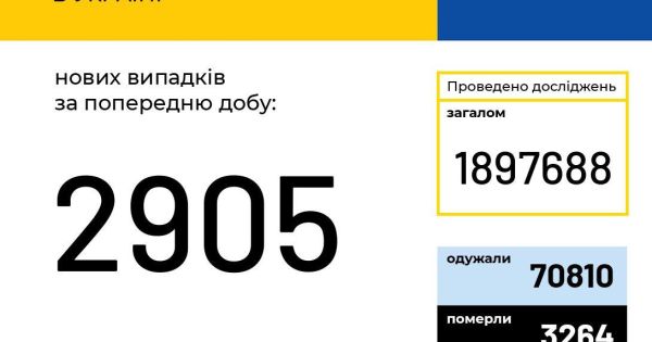 За даними Міністерства охорони здоровя в Україні зафіксовано 2 905 нових випадків коронавірусної хвороби COVID-19