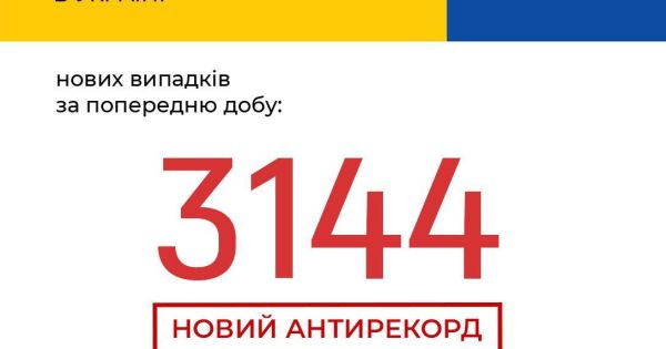 За даними Міністерства охорони здоров’я в Україні зафіксовано 3 144 нові випадки коронавірусної хвороби COVID-19 – це антирекорд кількості нових хворих за добу