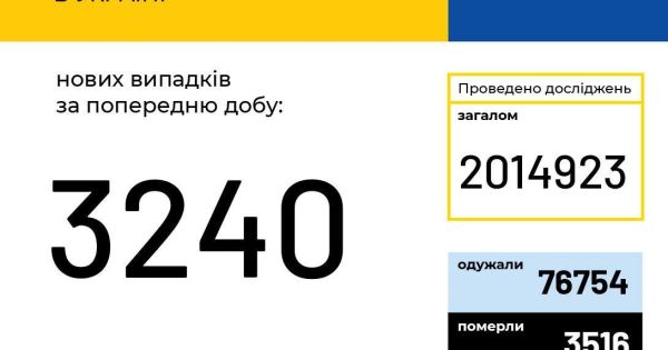За даними Міністерства охорони здоров'я в Україні зафіксовано 3 240 нових випадків коронавірусної хвороби COVID-19