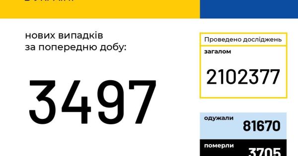 За даними Міністерства охорони здоров’я в Україні зафіксовано 3 497 нових випадків коронавірусної хвороби COVID-19