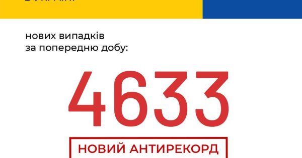 За даними Міністерства охорони здоровя в Україні зафіксовано 4 633 нових випадки коронавірусної хвороби COVID-19 — це антирекорд кількості нових хворих за добу