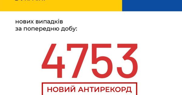 За даними Міністерства охорони здоров’я в Україні зафіксовано 4 753 нових випадки коронавірусної хвороби COVID-19 — це антирекорд кількості нових хворих за добу