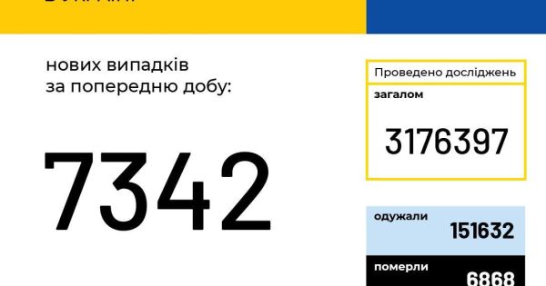 За даними Міністерства охорони здоров'я в Україні зафіксовано 7 342 нових випадки коронавірусної хвороби COVID-19
