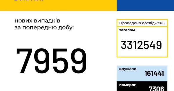 За даними Міністерства охорони здоров'я в Україні зафіксовано 7 959 нових випадків коронавірусної хвороби COVID-19
