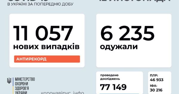 11 057 нових випадків коронавірусної хвороби COVID-19 зафіксовано в Україні станом на 12 листопада 2020 року. Зокрема, захворіли 428 дітей та 564 медпрацівники.