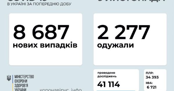 За даними Міністерства охорони здоровя за добу в Україні зафіксовано 8687 випадків коронавірусної хвороби