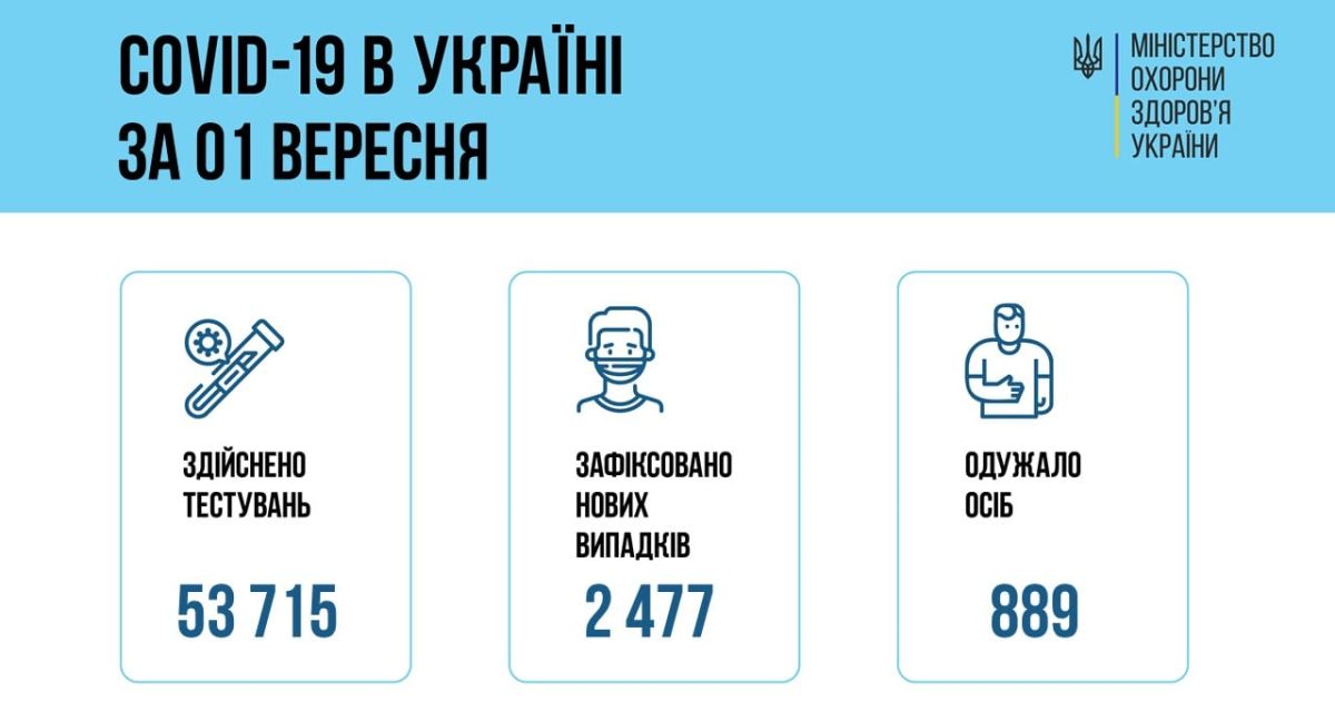 За добу 01 вересня 2021 року в Україні зафіксовано 2477 нових підтверджених випадків коронавірусної хвороби COVID-19 (з них дітей – 179, медпрацівників – 36)
