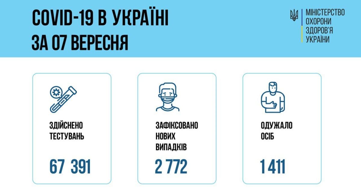 За добу 07 вересня 2021 року в Україні зафіксовано 2 772 нові підтверджені випадки коронавірусної хвороби COVID-19 (з них дітей – 254, медпрацівників – 46)