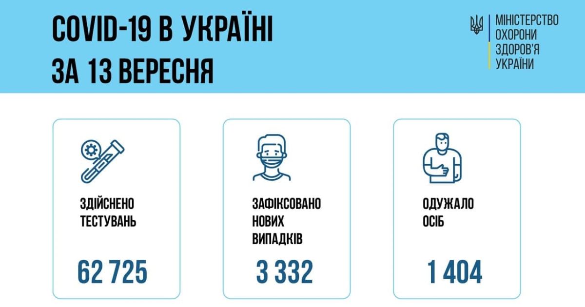 За добу 13 вересня 2021 року в Україні зафіксовано 3332 нових підтверджених випадків коронавірусної хвороби COVID-19 (з них дітей – 364, медпрацівників – 58)