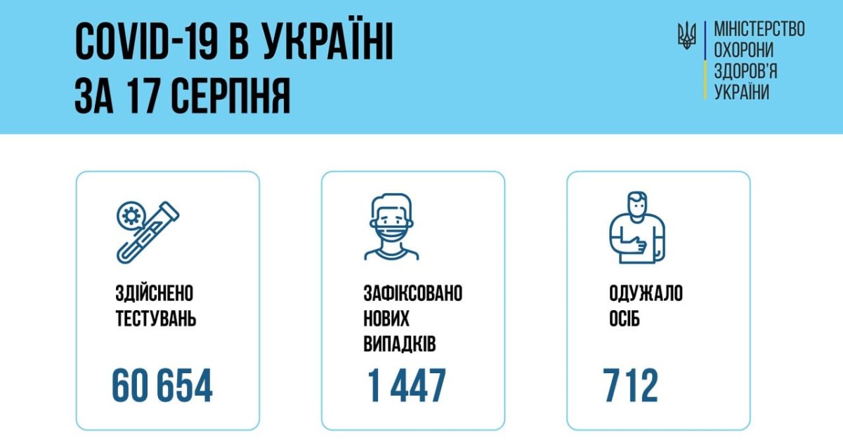 За добу 17 серпня 2021 року в Україні зафіксовано 1 447 нових підтверджених випадків коронавірусної хвороби COVID-19 (з них дітей – 104, медпрацівників – 38)