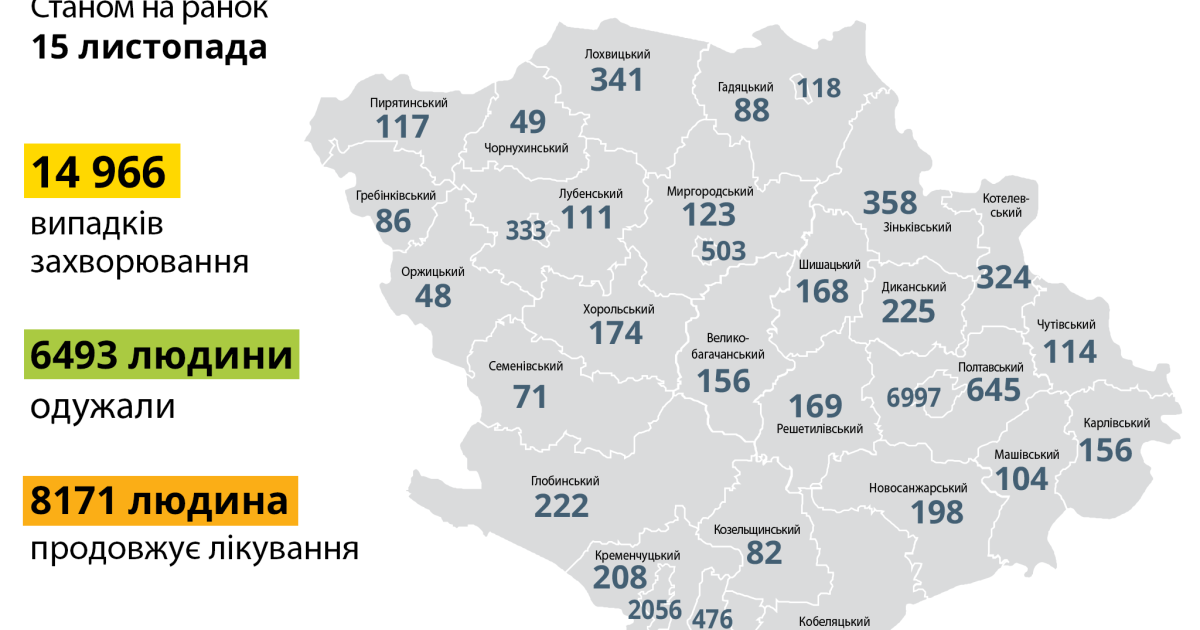 За інформацією Полтавського обласного лабораторного центру МОЗ України, від початку карантину на Полтавщині діагностували 14 966 випадків захворювання на COVID-19.