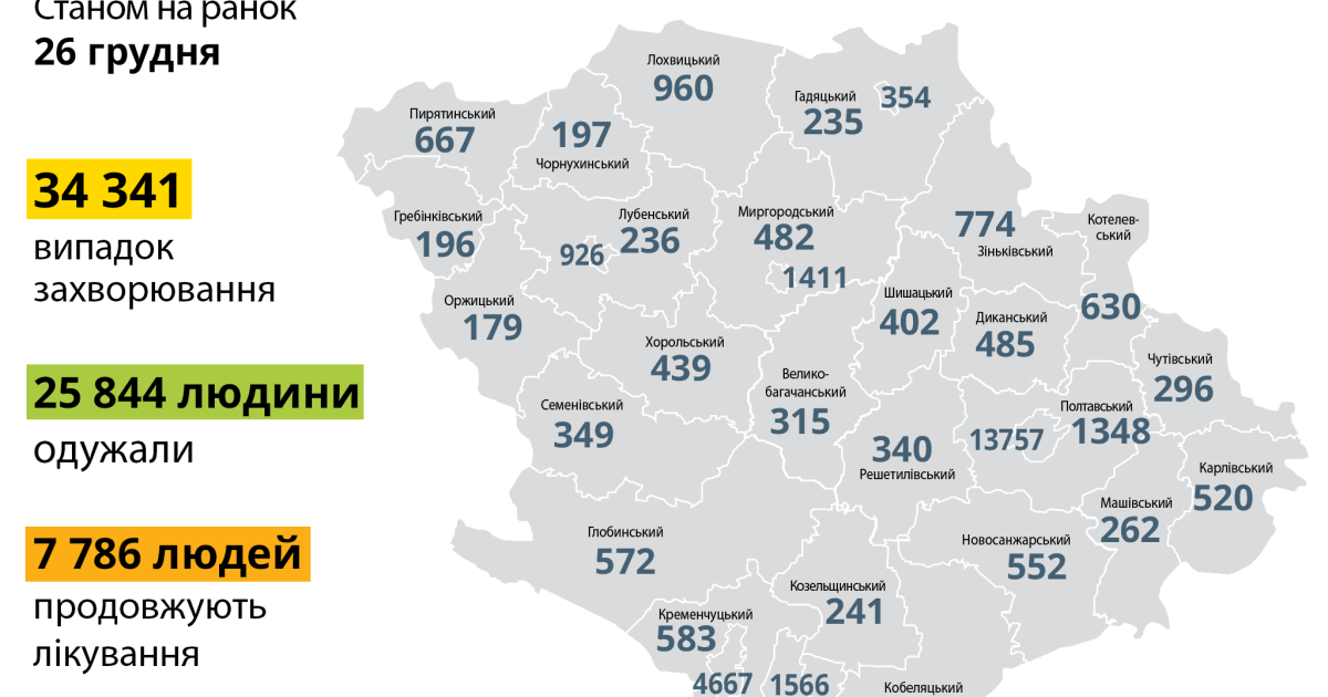 За інформацією Полтавського обласного лабораторного центру МОЗ України, від початку карантину на Полтавщині діагностували 34 341 випадок захворювання на COVID-19.
