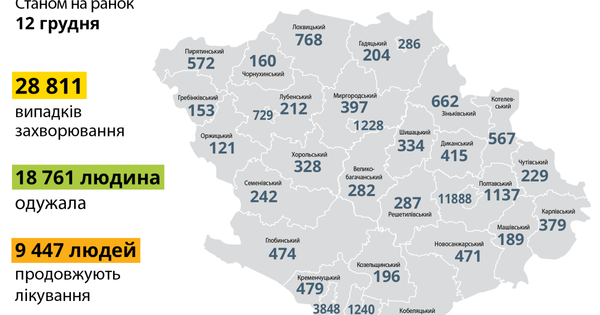 За інформацією Полтавського обласного лабораторного центру МОЗ України, від початку карантину на Полтавщині діагностували 28 811 випадків захворювання на COVID-19.