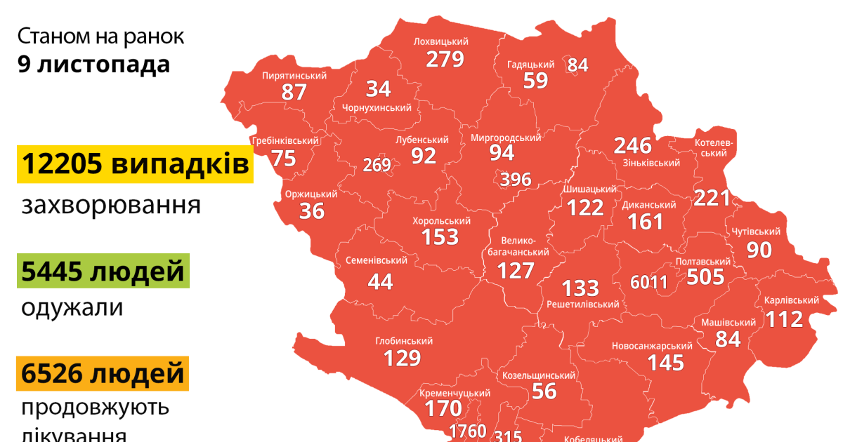 За інформацією Полтавського обласного лабораторного центру МОЗ України, від початку карантину на Полтавщині діагностували 12 205 випадків захворювання на COVID-19.