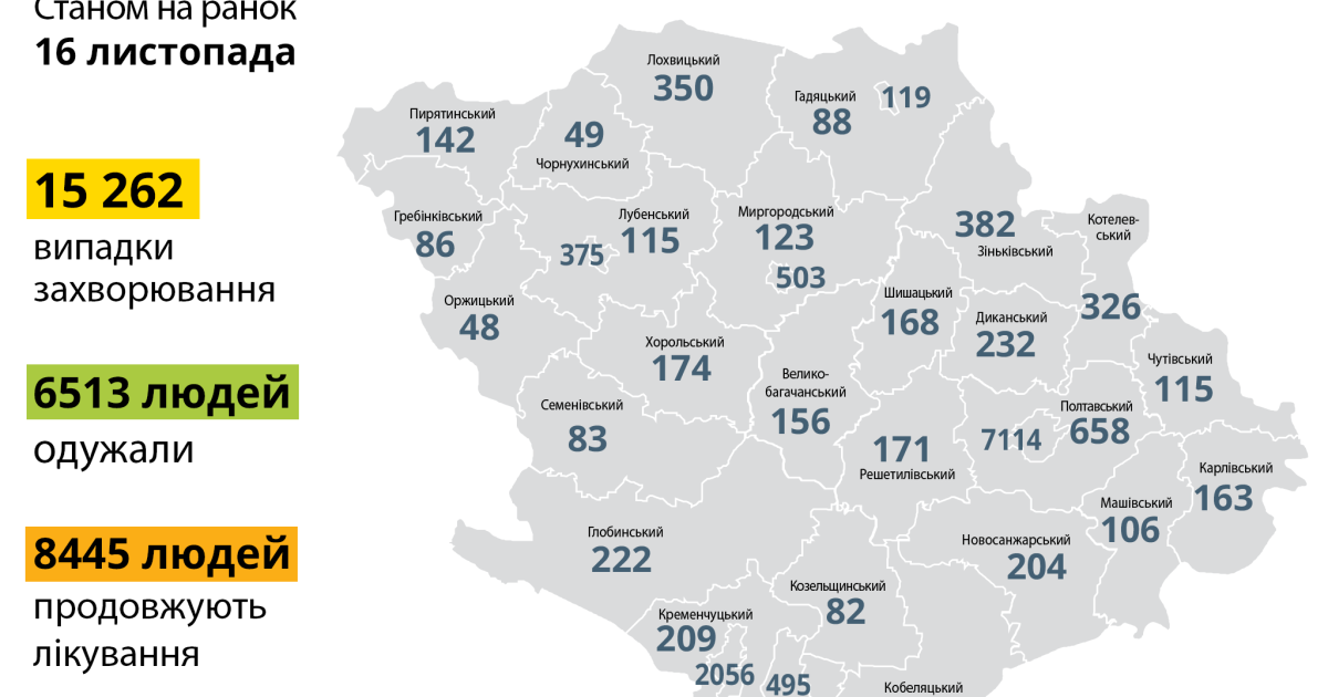 За інформацією Полтавського обласного лабораторного центру МОЗ України, від початку карантину на Полтавщині діагностували 15 262 випадки захворювання на COVID-19.