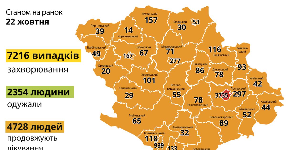 За інформацією Полтавського обласного лабораторного центру МОЗ України, від початку карантину на Полтавщині діагностували 7216 випадків захворювання на COVID-19.