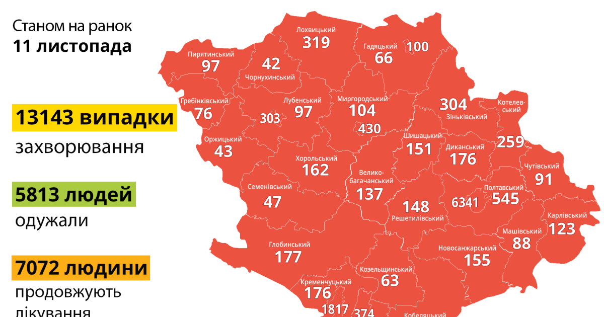 За інформацією Полтавського обласного лабораторного центру МОЗ України, від початку карантину на Полтавщині діагностували 13 143 випадки захворювання на COVID-19.