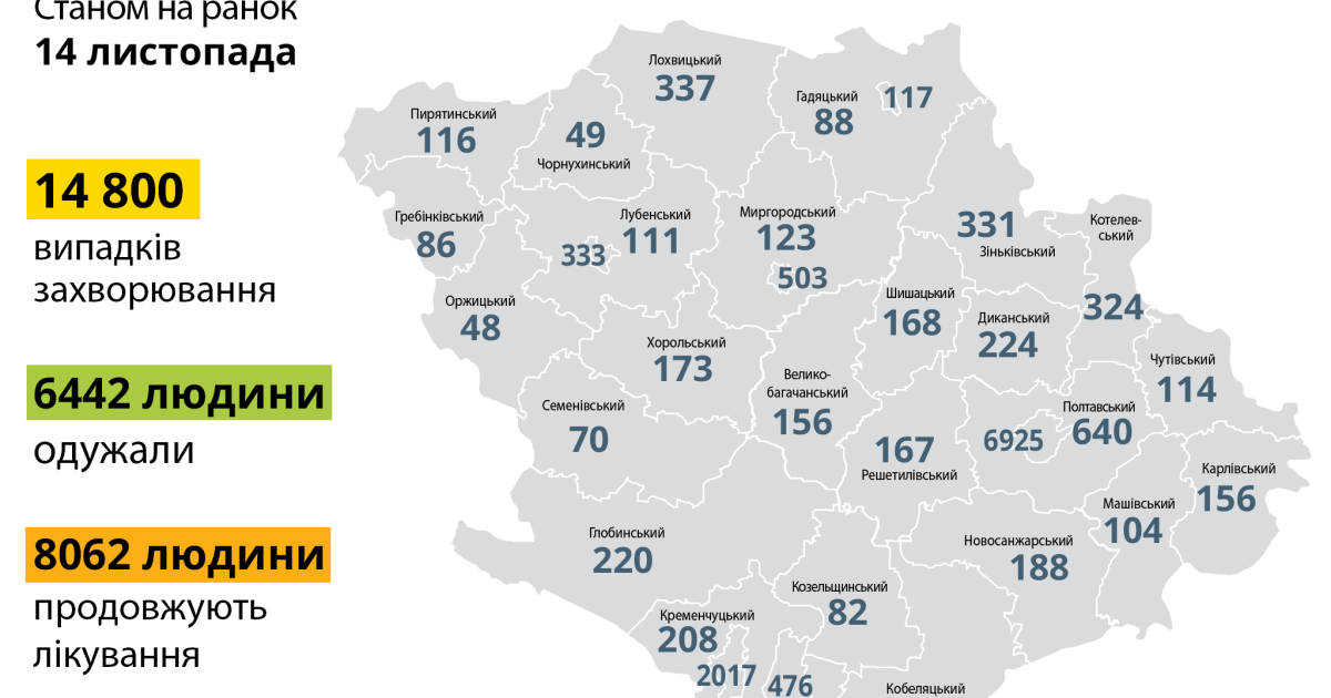 За інформацією Полтавського обласного лабораторного центру МОЗ України, від початку карантину на Полтавщині діагностували 14 800 випадків захворювання на COVID-19.