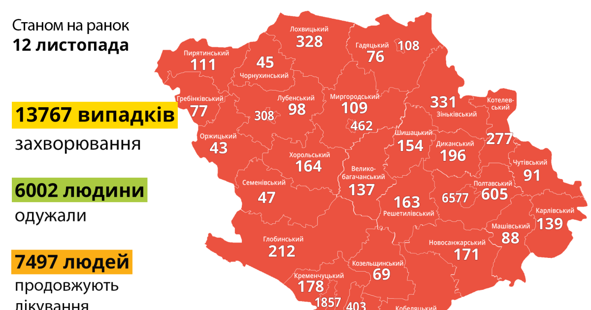 За інформацією Полтавського обласного лабораторного центру МОЗ України, від початку карантину на Полтавщині діагностували 13 767 випадків захворювання на COVID-19. Одужали 6002 (+189 за добу) жителі області, продовжують лікування 7497 людей, зокрема 171 дитина. Всього зареєстровано 268 летальних випадків, нових за добу – 10 (Полтава – 5; Оржицький район – 2; Кременчук – 1; Лохвицький район – 1; Полтавський район – 1).