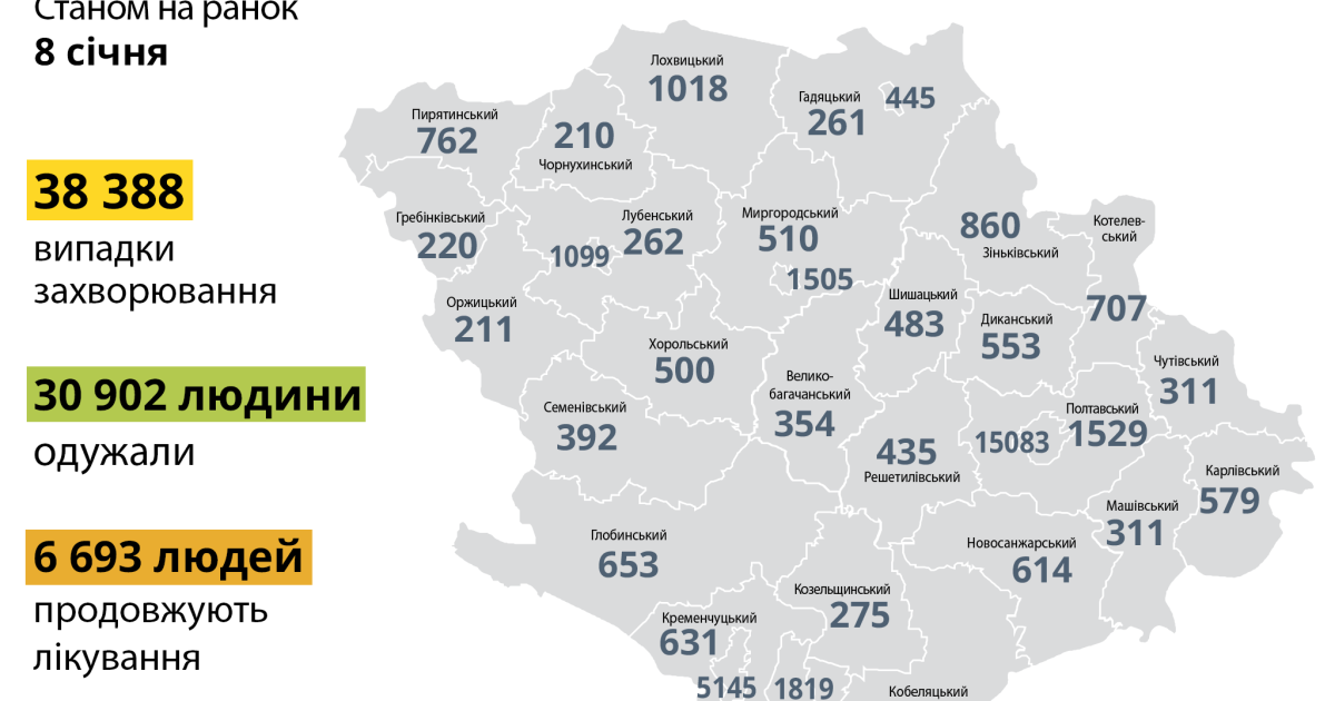 За інформацією Полтавського обласного лабораторного центру МОЗ України, від початку карантину на Полтавщині діагностували 38 388 випадків захворювання на COVID-19.