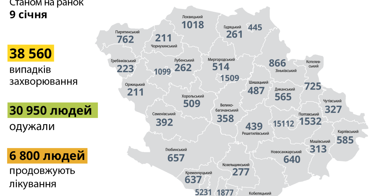 За інформацією Полтавського обласного лабораторного центру МОЗ України, від початку карантину на Полтавщині діагностували 38 560 випадків захворювання на COVID-19.