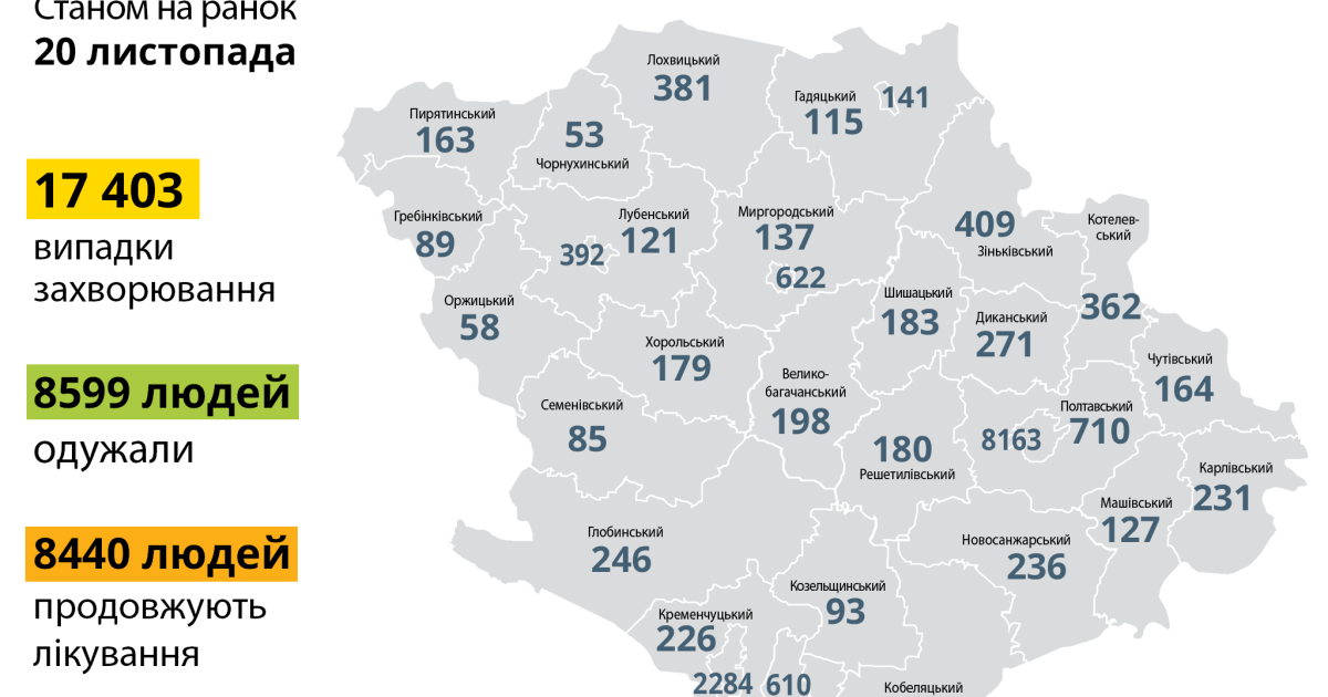 За інформацією Полтавського обласного лабораторного центру МОЗ України, від початку карантину на Полтавщині діагностували 17 403 випадки захворювання на COVID-19.