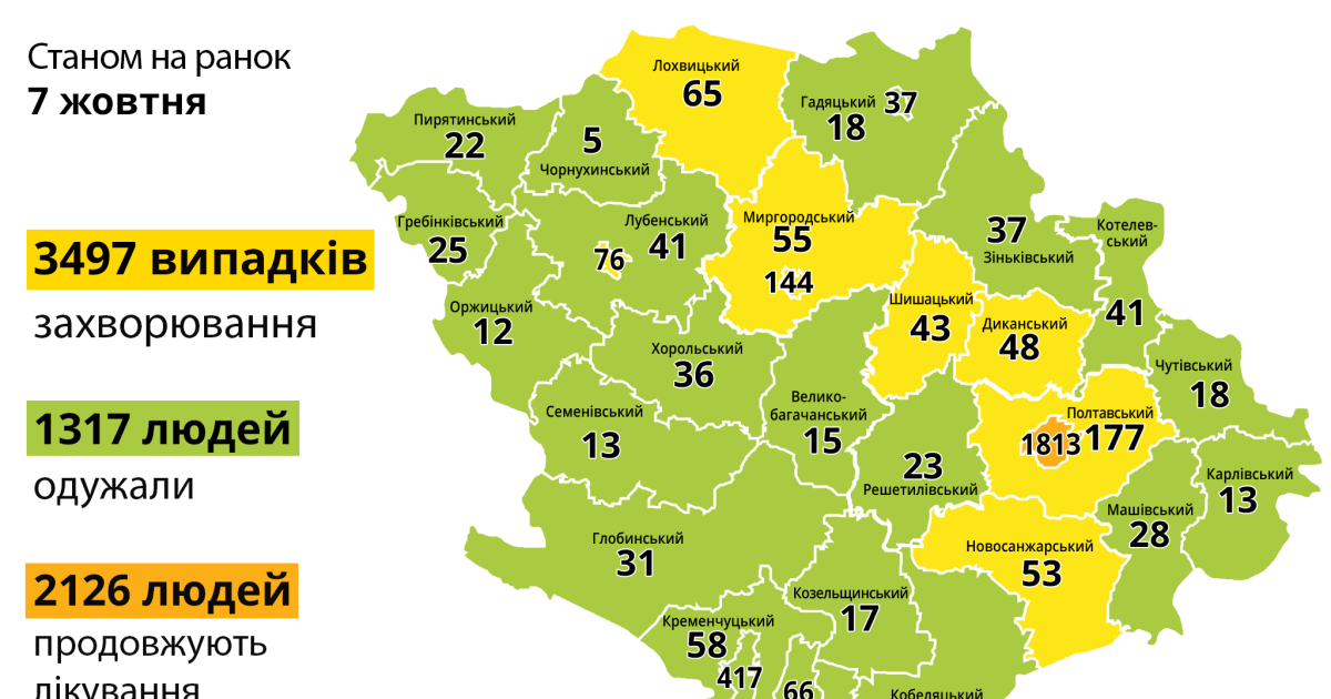 За інформацією Полтавського обласного лабораторного центру МОЗ України, від початку карантину на Полтавщині діагностували 3497 випадків захворювання на COVID-19. Одужали 1317 жителів області. Продовжують лікування 2126 людей, зокрема 111 дітей. Всього зареєстровано 54 летальні випадки, нових за добу – 4 (2 – Кременчук, Машівський і Лохвицький райони).