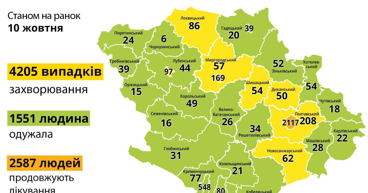 За інформацією Полтавського обласного лабораторного центру МОЗ України, від початку карантину на Полтавщині діагностували 4205 випадків захворювання на COVID-19.