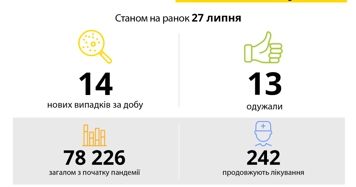 Одужали 76112 (+13) жителів області, продовжують лікування 242 людини. Усього зареєстровано 1872 летальні випади.