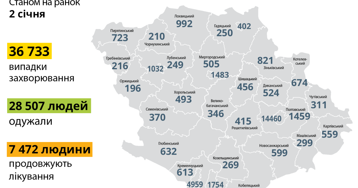 За інформацією Полтавського обласного лабораторного центру МОЗ України, від початку карантину на Полтавщині діагностували 36 733 випадки захворювання на COVID-19.