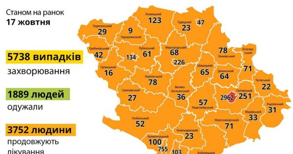 За інформацією Полтавського обласного лабораторного центру МОЗ України, від початку карантину на Полтавщині діагностували 5738 випадків захворювання на COVID-19. Одужали 1889 жителів області. Продовжують лікування 3752 людини, зокрема 156 дітей. Всього зареєстровано 97 летальних випадків, нових за добу – 5 (2 – у Полтаві, Кременчук, Глобинський, Шишацький райони).