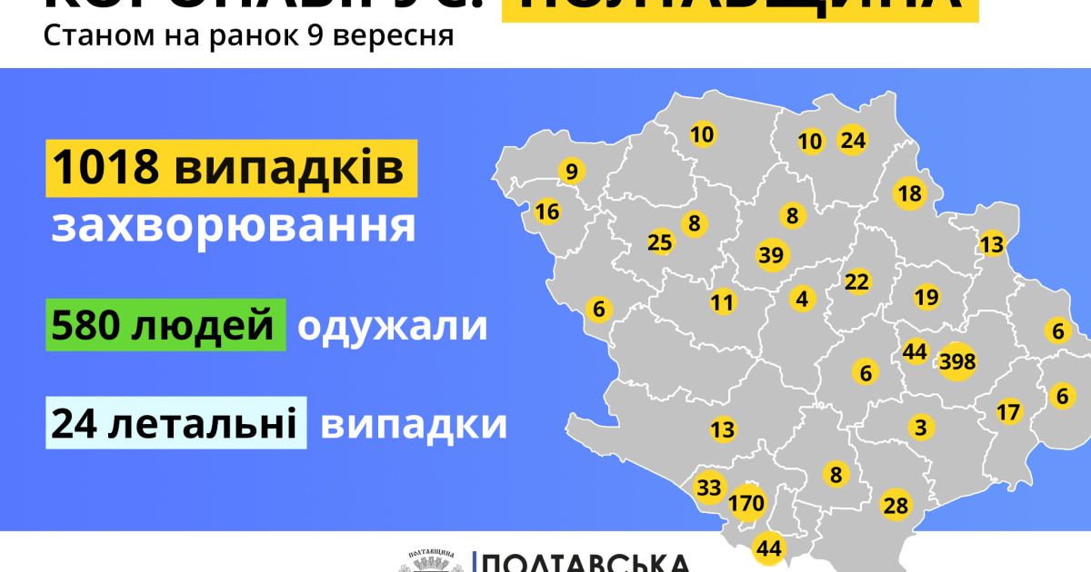 Полтава – 398 (13 нових випадків), Кременчук – 170, Полтавський район – 44, Горішні Плавні – 44, Миргород – 39, Кременчуцький район – 33, Кобеляцький район – 28, Лубни – 25, Гадяч – 24, Шишацький район – 22, Диканський район – 19 (4 нові випадки), Зіньківський район – 18 (2 нові випадки), Машівський район – 17, Гребінківський –16, Глобинський район – 13, Котелевський – 13 (2 нові випадки), Хорольський район – 11, Гадяцький і Лохвицький райони – по 10, Пирятинський район – 9 (1 новий випадок), Козельщинський, Лубенський і Миргородський райони – по 8, Решетилівський район – 6 (уточнені дані), Карлівський, Оржицький і Чутівський райони – по 6, Великобагачанський район – 4, Новосанжарський район – 3.