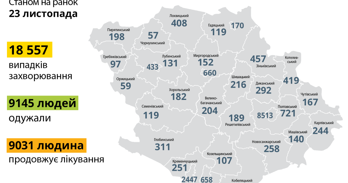 За інформацією Полтавського обласного лабораторного центру МОЗ України, від початку карантину на Полтавщині діагностували 18 557 випадків захворювання на COVID-19. Одужали 9 145 (+22 за добу) жителів області, продовжує лікування 9 031 людина, зокрема 146 дітей.