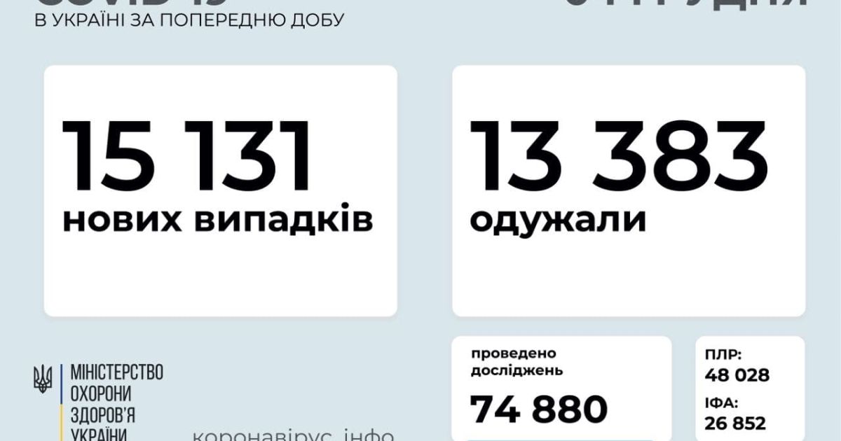 15 131 новий випадок коронавірусної хвороби COVID-19 зафіксовано в Україні станом на 4 грудня 2020 року. Зокрема, захворіли 649 дітей та 681 медпрацівник.