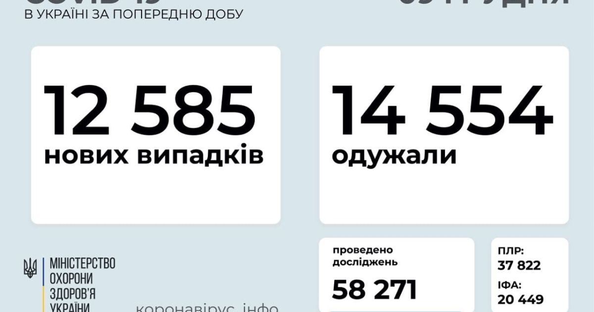 12 585 нових випадків коронавірусної хвороби COVID-19 зафіксовано в Україні станом на 9 грудня 2020 року. Зокрема, захворіли 654 дитини та 682 медпрацівники.