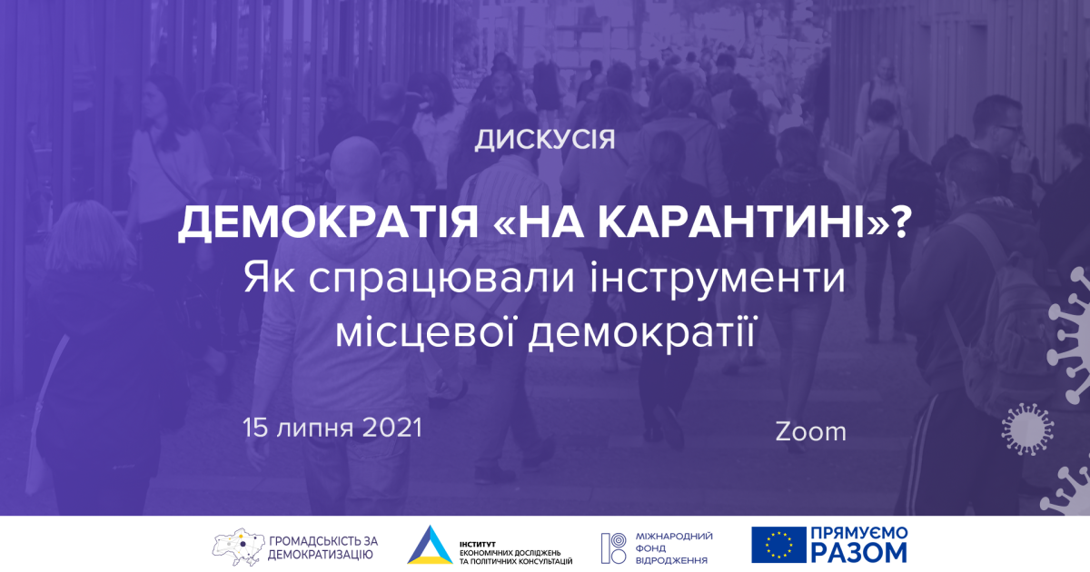 Запрошуємо 15 липня 2021 року взяти участь у публічній дискусії «Демократія "на карантині"? Як спрацювали інструменти місцевої демократії». Захід відбудеться в межах проєкту «Громадськість за демократизацію» за сприяння Європейського Союзу та проєкту «Вплив пандемії COVID-19 на ефективність співпраці ОГС з регіональною владою в Україні» за підтримки Міжнародного фонду «Відродження», які реалізуються Інститутом економічних досліджень та політичних консультацій.